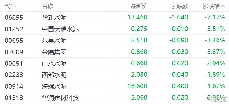 建材水泥股集体弱势,华新水泥跌7.17%,中国天瑞水泥、东吴水泥、金隅集团跌超3%,山水水泥、西部水泥、海螺水泥跟跌。