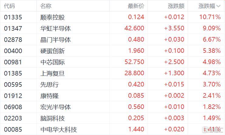 半导体板块逆势大涨,华虹半导体涨超9%,晶门半导体涨超6%,中芯国际涨近5%。