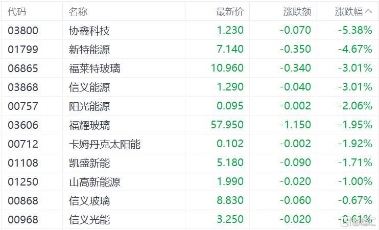光伏太阳能股多数下跌,协鑫科技跌5.38%,新特能源跌4.67%,福莱特玻璃、信义能源跌超3%,福耀玻璃、凯盛新能跌超1%。