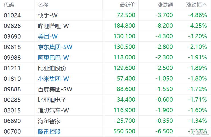 大型科技股多数表现低迷,快手跌近5%,美团跌超3%,京东、阿里巴巴、小米皆下跌。