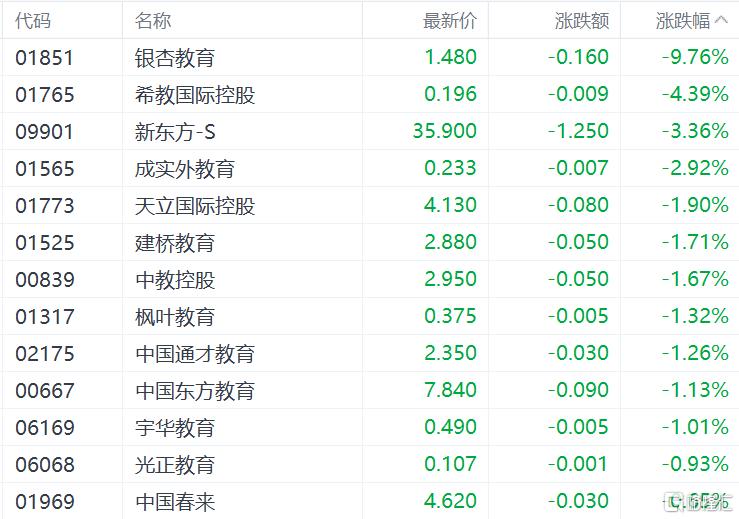 内地教育股普跌,银杏教育跌超9%,希教国际控股跌超4%,新东方-S跌超2%,成实外教育、建桥教育、中教控股、枫叶教育、宇华教育、光正教育纷纷下跌。