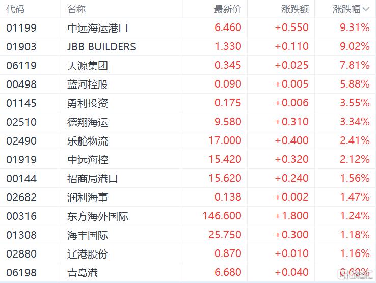 航运及港口板块上涨,中远海运港口涨超9%,中远海控涨超2%,招商局港口、东方海外国际、海丰国际、辽港股份涨超1%。