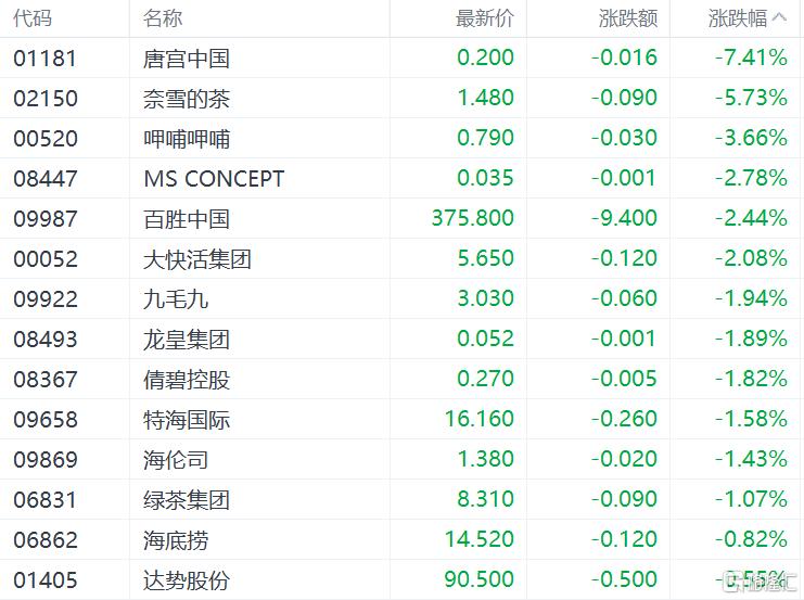 餐饮股下挫,奈雪的茶跌超5%,呷哺呷哺跌超3%,百胜中国、大快活集团跌超2%,九毛九、特海国际、海底捞跟跌。