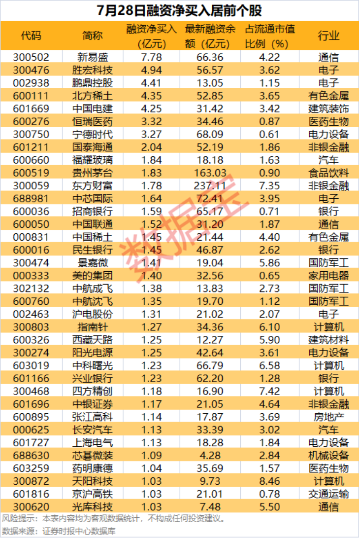 具体到个股,7月28日获融资净买入千万元以上的有656只,其中36只融资净买入额超亿元。新易盛融资净买入额居首,当日净买入7.78亿元;其次是胜宏科技、鹏鼎控股,融资净买入金额分别为4.94亿元、4.41亿元;融资净买入金额居前的还有北方稀土、中国电建、恒瑞医药等。