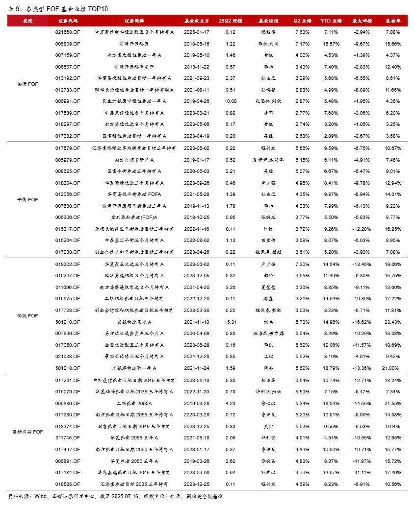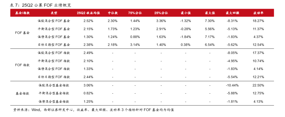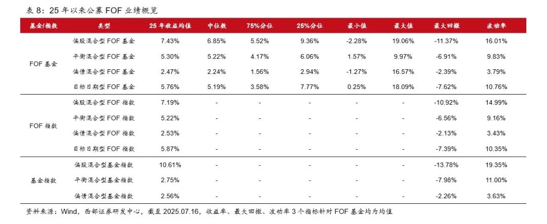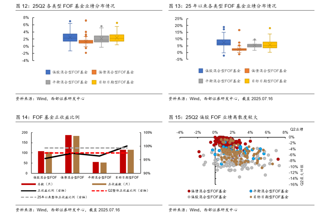 2季度,四类FOF基金收益率均为正。偏股混合型FOF、平衡混合型FOF、偏债混合型FOF、目标日期型FOF,25Q2收益率均值分别为2.52%、2.15%、1.30%、2.38%;25年以来(截至2025.07.16,下同)收益率分别为7.43%、5.30%、2.47%、5.76%。