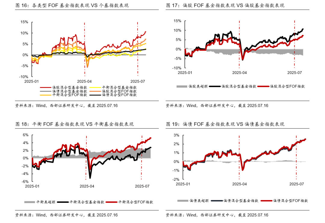 从各类FOF指数和对应风险的基金指数走势图中可见,偏股类FOF相对偏股混合型基金指数的超额,在25Q2及25年以来均为负,4月初市场波动较大时,有所恢复。FOF指数走势更稳健,抗风险能力较强。平衡FOF相对平衡混合型基金指数的超额,在25Q2及25年以来均为正。偏债FOF与偏债混合型基金指数,走势较接近。