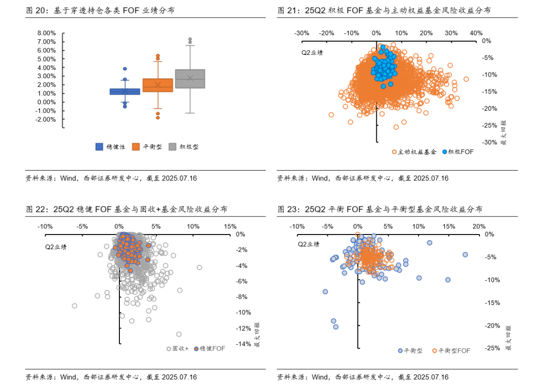 偏股类FOF离散度更高,偏债型FOF首尾差最小。将4类FOF产品收益率平均值、最大值、最小值、中位数制作为箱体图。25Q2,4类FOF平均值均超过中位数,偏债型FOF首尾差最小。25年以来,4类FOF平均值均超过中位数,偏债型FOF首尾差最小。从业绩和回撤的风险收益率分布散点图来看,偏股类FOF离散度较高。
