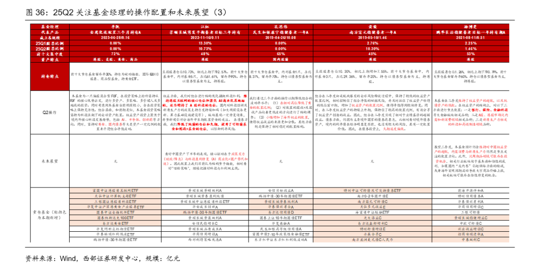 基金经理在2季报中核心观点:1)投资策略上,多位基金经理仍强调“多区域、多资产、多策略”的全球资产配置,但整体较上季度减少。2)权益仓位上,多数基金经理超配A股,把握结构性机会。一方面,大多维持相对中枢超配;一方面,少量基金经理把握25年4月初关税扰动带来的机会,灵活调整仓位。比如,有基金经理提到,提前定价对等关税相关风险,对于风险资产进行前瞻性减仓,并在25年4月7日市场风险充分释放后提升风险资产仓位,有效控制了组合波动,同时抓住“调整后”的机会。3)港股仓位上,多数增配,少数基于AH性价比减持。有基金经理提到,基金在港股暴露上保持超配,但随着 AH 溢价率的下行,适度降低了港股的超配比例。4)风格上,成长、小盘为主,兼顾红利。5)结构上,港股科技、创新药、新消费、高端制造成为主线。6)国内债券资产上,多数基金经理维持中短久期,基于股债性价比,低配固收资产。少数基金经理,在2季度把握债券调整后的机会,择机拉长久期,以被动型基金为主。面对国内低利率时代,一方面转向固收+、可转债,向风险资产要收益,一方面转向高票息的海外债券。7)美股等海外权益上,关注度降低,有所分化。有基金经理加仓美股,有基金经理基于美股性价比转向欧洲股市、A股,少量基金经理波段操作美股。8)美债资产上,多数基金经理基于资产配置视角、高票息逻辑增配美债基金,少数基金经理明确清仓美债基金。9)黄金资产上,一方面,基于地缘政治、与国内资产低相关性,继续维持配置;一方面,扩展商品子类资产,比如豆粕、白银等。