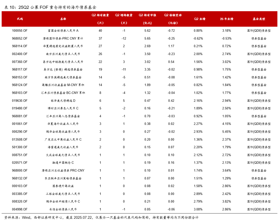 公募FOF基金可投资的海外债券基金包括QDII债基、香港互认债券型基金。(1)25Q2被FOF基金持仓数量最多的前三名为富国全球债券(40只基金持有)、摩根国际债券(37只基金持有)、华夏精选固定收益配置(27只基金持有);(2)富国全球债券、摩根国际债券、南方亚洲美元债是持仓市值前三。(3)银华美元债精选被增持数量最多,其次为易方达中短期美元债、华夏精选固定收益配置等,整体增持较少。(4)长信全球债券25Q2业绩表现较好,在3%以上;25年以来(截至2025.07.22),鹏华全球高收益债业绩表现较好。