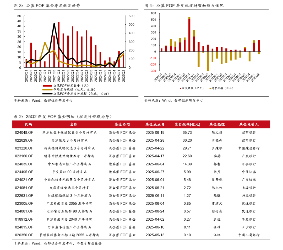 2季度,公募FOF基金新发数量14只,新发规模合计186.04亿元,延续25Q1的回暖趋势,平均单只基金发行规模13.29亿元。东方红盈丰稳健配置6个月持有,以募集规模65.73亿元居首,该基金为混合型FOF,基金经理陈文扬,托管行为招商银行。另外,南方稳见3个月持有、招商稳健策略优选3个月持有、前海开源康悦稳健养老一年持有、中加智选回报三个月持有,这4只基金新发规模均超10亿元。
