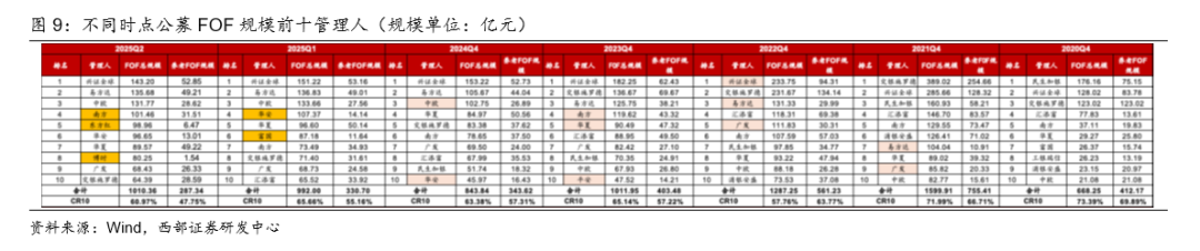 25Q2公募FOF基金公司规模CR10降低至60.97%。从不同时点规模前十名FOF管理人来看,25Q2公募FOF管理人CR10(前十大集中度)为60.97%,较25Q1的65.66%降低4.69pct。养老FOF规模前十大管理人集中度在47.75%,较25Q1下降7.40pct。