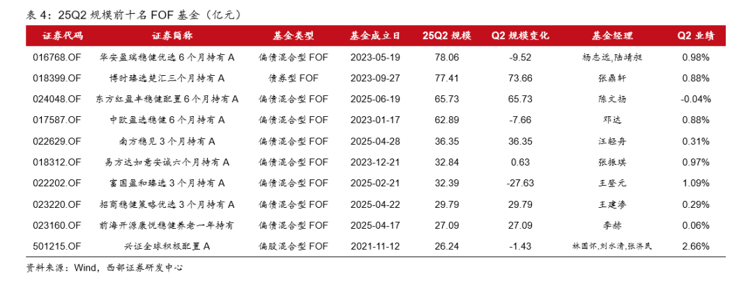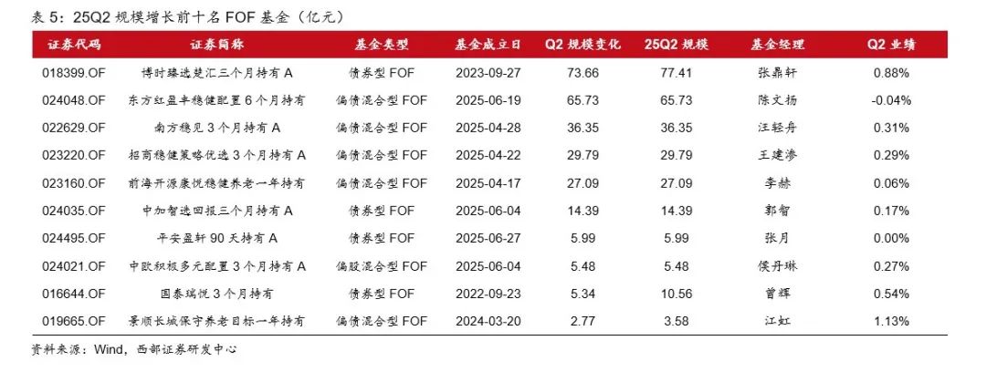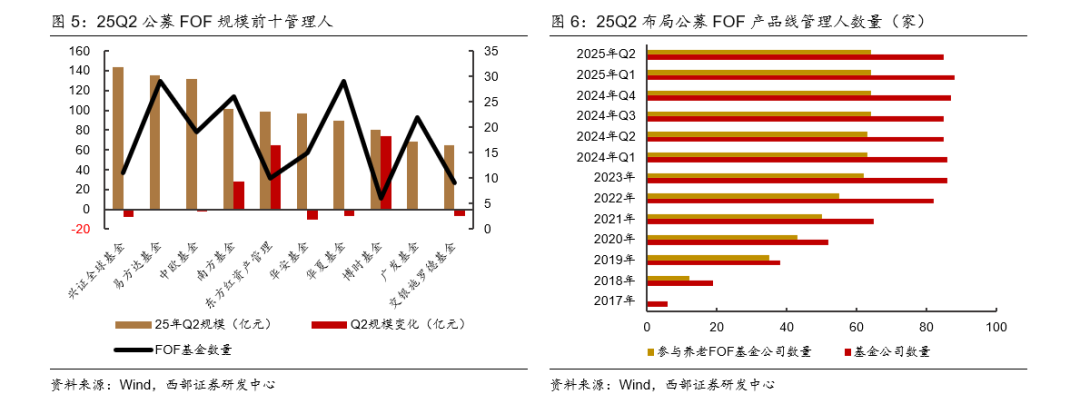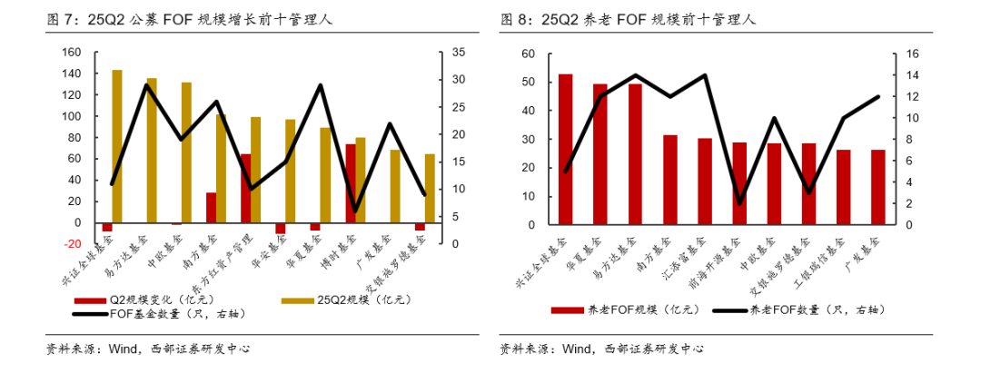 从规模变化看,25Q2有34家基金公司FOF规模上升。博时、东方红规模增长超60亿元,招商、南方、前海开源规模增长超20亿元,中加规模增长超10亿元。