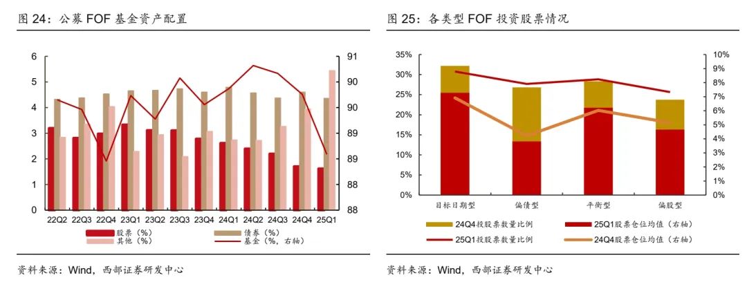 FOF基金要求不低于80%基金资产投资于公募基金,其余部分可少量投资股票、债券等资产。从持仓结果来看,FOF基金仍主要投资基金,基金占比维持在88%-91%之间,处于超配状态;在债券资产上比例维持在4.5%左右,满足流动性需求;股票投资比例维持在5%以内。25Q2基金资产比例为90.26%,较25Q1提高1.67pct;25Q2股票资产比例连续9个季度下滑,降至1.52%,较25Q1降低0.10pct。