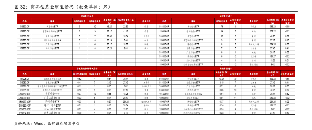 商品型基金中,(1)25Q2被FOF基金持仓数量最多的前三名为华安黄金ETF(79只基金持有)、易方达黄金ETF(14只基金持有)、华夏黄金ETF(10只基金持有);(2)25Q2被FOF基金增持数量前三的基金为华夏黄金ETF/华夏饲料豆粕期货ETF(6只基金增持)、富国上海金ETF(5只基金增持)、国投瑞银白银期货(3只基金增持);(3)25Q2被FOF基金增持份额数最多的前三名为国投瑞银白银期货(被增持0.62亿份)、富国上海金ETF(被增持0.41亿份)、建信易盛郑商所能源化工期货ETF(被增持0.11亿份);(4)25Q2被FOF基金持仓市值前三的基金为华安黄金ETF(持仓246.55亿元)、博时黄金ETF(持仓239.35亿元)、易方达黄金ETF(持仓179.91亿元)。