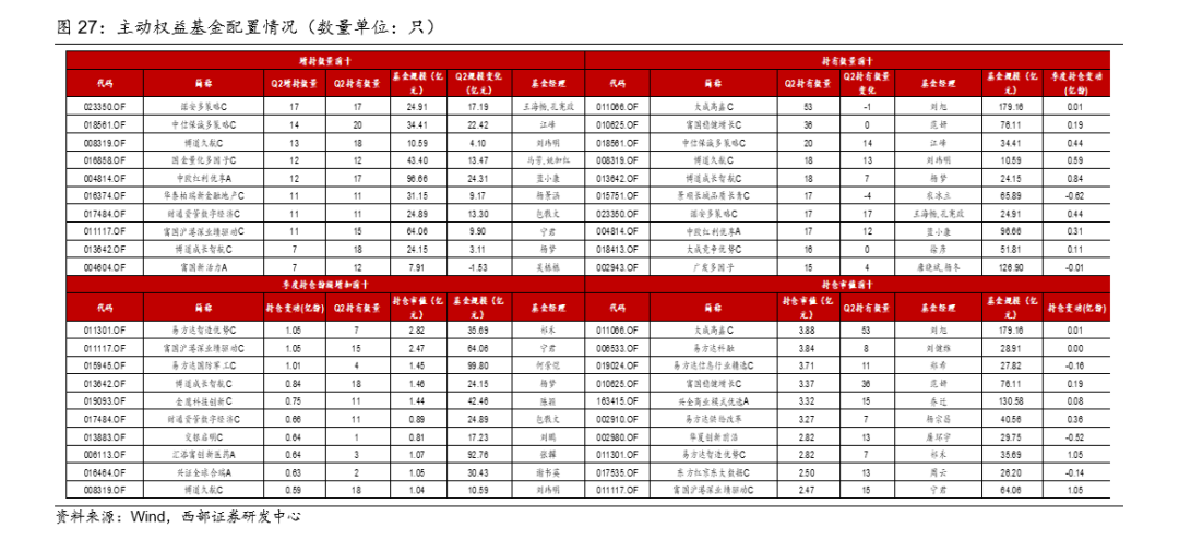 25Q2,被增持较多的主动权益基金为诺安多策略、中信保诚多策略、博道久航等;被动型基金中持仓规模前三为富国中证港股通互联网ETF、国泰中证全指数证券公司ETF、鹏华中证酒ETF;指增基金被持有数量前三为招商中证1000指增、国泰君安中证1000指增、汇添富沪深300指增;固收+基金被增持较多的为景顺长城四季金利、南方昌元可转债A、永赢稳健增强等;纯债基金被增持数前三为景顺长城景泰纯利、国泰上证10年期国债ETF、平安中债-中高等级公司债利差因子ETF;商品型基金增持数量居前为华夏黄金ETF、华夏饲料豆粕期货ETF、富国上海金ETF、国投瑞银白银期货。