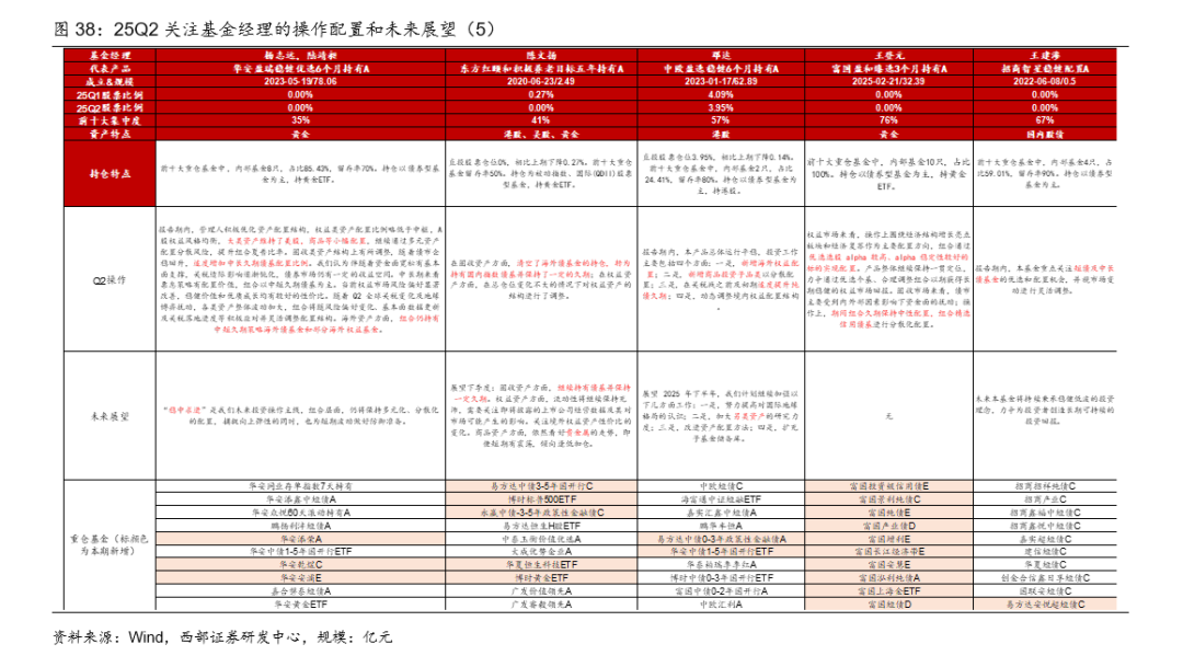我们从三个角度筛选关注基金经理,第一个角度是25Q2业绩优异,选择各类型排名前10的FOF基金现任基金经理,第二个角度是在管规模前10名基金经理,第三个角度是基金管理人FOF规模前10名的代表性基金经理。综合考虑这些筛选角度并去除重复项之后,我们筛选出30名基金经理,来看其2季度的配置情况、核心操作及未来展望。留存率为25Q1前十大持仓基金在25Q2中仍留存的比例。集中度为前十大持仓基金规模占基金净资产比例。新增基金为25Q1中未持有,25Q2新增持。