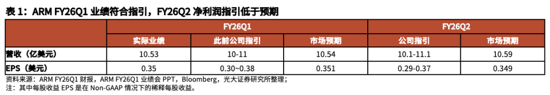 事件:FY26Q1业绩符合指引,FY26Q2指引平淡。1)FY26Q1:FY26Q1营收10.53亿美元,YoY+12%,QoQ-15%,符合此前公司10-11亿美元指引区间,市场预期10.54亿美元。授权收入4.68亿美元,YoY-1%;版税收入5.85亿美元,YoY+25%,系Armv9架构占比提升、Arm芯片在数据中心的使用量增长、CSS芯片放量。盈利方面,FY26Q1 Non-GAAP EPS 0.35美元,YoY-12.50%,符合此前公司0.30~0.38美元指引区间,市场预期0.351美元。2)FY26Q2利润指引偏弱:公司指引FY26Q2营收10.1~11.1亿美元,中值对应YoY+25.6%,QoQ+0.7%,市场预期10.59亿美元;指引FY26Q2 Non-GAAP EPS 0.29~0.37美元,中值较市场预期的0.349美元低5.4%。公司计划加大研发投入聚焦CSS、AI计算和chiplets。3)地缘政治影响:关税对公司的直接影响有限;FY26Q1中国营收占比 21%(QoQ+6pct,YoY+7pct)。