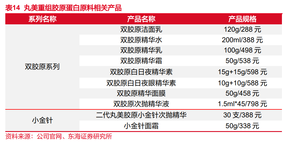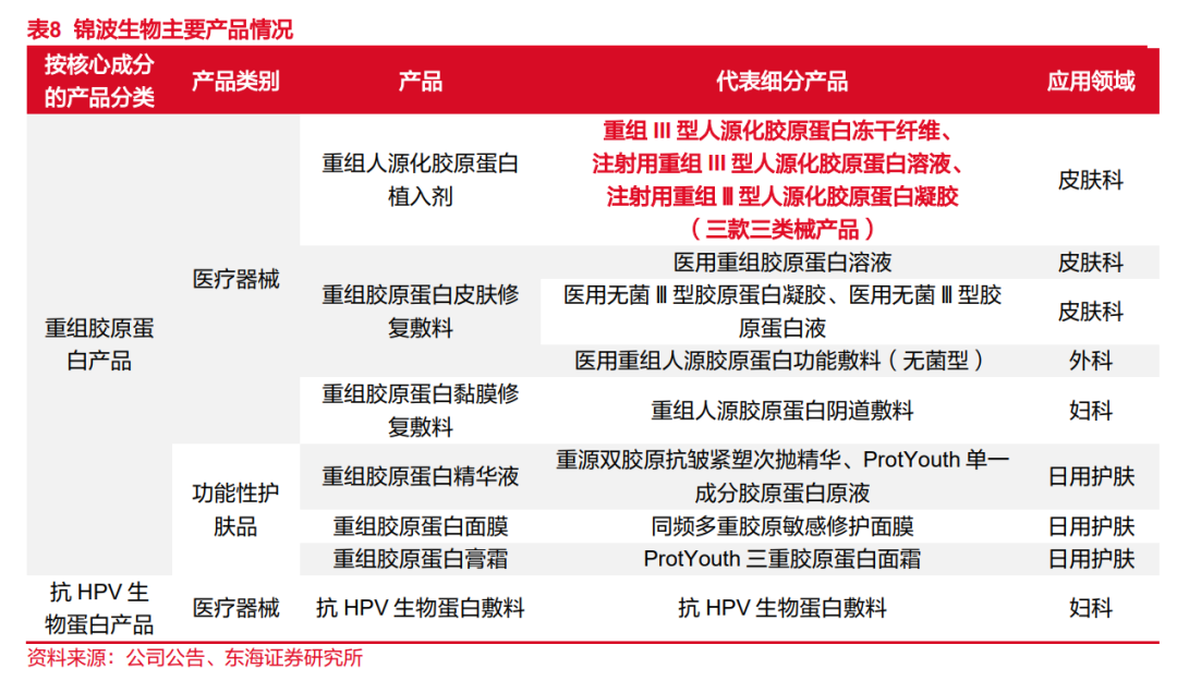 公司产品管线丰富,核心产品竞争力强,具有先发优势。公司已建立了从上游功能蛋白核心原料到医疗器械、功能性护肤品等终端产品的全产业链业务体系,产品可应用在妇科、皮肤科、外科、五官/口腔科、肛肠科、护肤等不同应用场景中。1)重组胶原蛋白产品:重组胶原蛋白包含了医疗器械及功能性护肤两个领域。其中医疗器械以三类械医美植入剂、二类械皮肤修复敷料和二类械妇科黏膜修复敷料等为主,拥有薇旖美、薇芙美、薇润、媤润、初蓉等多个品牌;功能性护肤产品包含精华原液、面膜、膏霜水乳等多个类型,主要用于皮肤的日常养护,拥有肌频、重源、ProtYouth?等品牌。2)抗HPV生物蛋白产品:公司的抗HPV生物蛋白产品主要是抗HPV生物蛋白敷料,含有核心成分酸酐化牛β-乳球蛋白,其能够有效阻断HPV感染。公司产品为大分子蛋白作抑制剂,不进入人体血液循环,安全性较高。