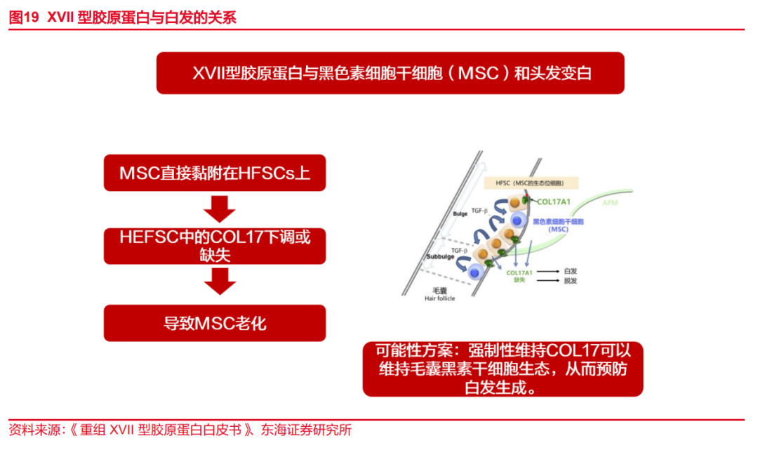 重组XVII型胶原蛋白具有减缓头发数量减少、增加局部毛发密度、提升头发直径的功效。头皮皮下组织的营养成分是头发健康的重要影响因素之一,而胶原蛋白又在头发真皮层中为头发提供了营养。头发最外层是毛鳞片,中间的皮质层富含胶原蛋白,最中心的则为发髓。一般情况下,头发干枯分叉主要就是由于胶原蛋白的缺失,因此为头发补充胶原蛋白可以促进头发的柔顺与光泽。同时研究已经表明,XVII型胶原蛋白与毛囊干细胞(HFSC)和黑色素细胞干细胞(MSC)的生态位密切相关,可参与调控毛囊周期和头发生长,与治疗白发、脱发密切相关。