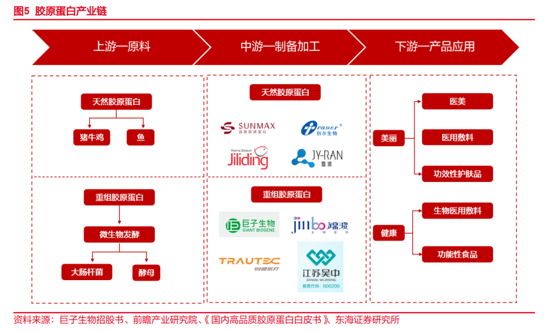 产业链一体化趋势不断发展。胶原蛋白产业链可分为上游原材料供应、中游制备加工以及下游的产品应用。目前随着国内产业一体化趋势发展,产业协同效率快速提升,行业进入快速发展期。从不同公司布局来看,我们大致分为原料及OEM商(创健医疗、聚源生物等)、原料及终端一体商(巨子生物、锦波生物等)及化妆品/医美产品商(敷尔佳、丸美股份、珀莱雅等)。