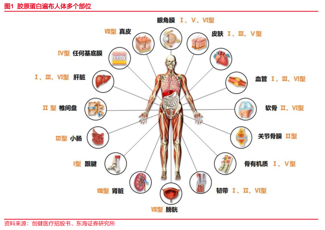 胶原蛋白作为人体的“生命之架”,广泛存在于人体中,是人体不可缺少的成分。胶原蛋白广泛分布于软组织以及硬结缔组织中,为皮肤、骨骼、肌腱、韧带和其他组织提供强度、柔韧性和结构支持,在人体中起到免疫原性低、可生物降解性、生物相容性、促进细胞生长、止血性等功能,发挥多种重要的生物学功能。