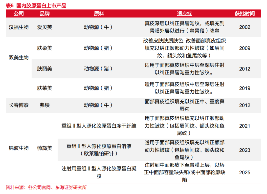 国内竞争格局良好,合规产品少,多家企业布局,市场前景阔。当前国内获批三类械产品少,市场格局好,且仅4家公司产品获批,其中仅有锦波生物3款(分别于2021/2023/2025年拿证)为重组胶原蛋白产品,产品取证周期长,获证企业具备先发优势。