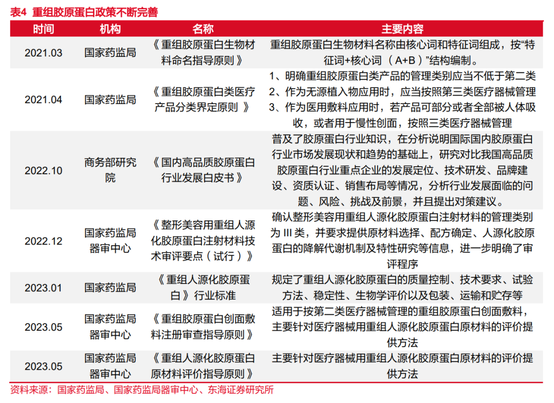 国内重组胶原蛋白技术领先。1)相较于动物源胶原蛋白,重组胶原蛋白自身具备无病毒隐患、低排异反应、生物相容性好、质量可控、可加工等优势,且国内技术领先,国内重组胶原蛋白技术较海外起步较早,技术处于全球领先水平,目前已形成了完整的产业链,从原料研发到终端应用均处于快速发展阶段。2)国内配套政策完善。国家高度重视胶原蛋白行业发展,从命名、分类界定、行业标准等多个方面出台政策支持行业合规化前进。
