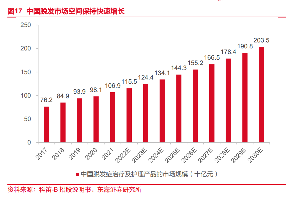 我国头脱发群体人数多,未来仍存增长空间。随着当代社会节奏的变快,年轻人的压力增大,以及不良饮食/作息习惯影响导致脱发问题越发成为一个普遍问题。中国脱发症治疗及护理产品市场规模有望从2017年762亿元提升至2024年的1341亿元。