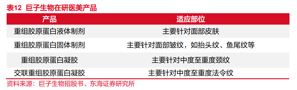医美后续成长空间大。目前公司储备有四款医美产品,分别为重组胶原蛋白液体制剂、重组胶原蛋白固体制剂、重组胶原蛋白凝胶和交联重组胶原蛋白凝胶,应用于水光类、眉间和鱼尾纹、鼻唇沟和法令纹及颈纹等领域。