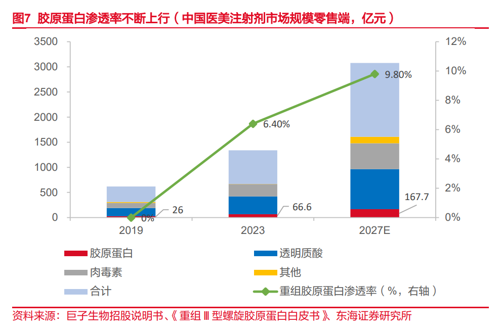 胶原蛋白占比在注射类医美市场中不断上行。从国内市场来看,整体胶原蛋白注射市场规模有望从2023年的66.6亿元提升至2027年的167.7亿元,其中重组胶原蛋白医美注射市场有望从43亿元提升至143亿元,在注射类医美中的渗透率从2023年的6.4%有望提升至2027年的9.8%,且重组胶原蛋白在2023-2027年CAGR有望保持35.4%,远超整体医美注射剂增速。
