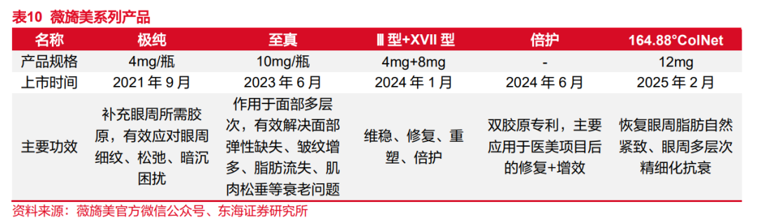 多规模、多集合共同促进公司产品升级拓展客群。薇旖美目前推出了不同极纯、至真等多个型号,极纯(4mg)主要以眼周基础需求为主,上市以来快速放量,目前仍是主要增长动力;至真(10mg)针对面部多层次注射,实现全面抗衰逆龄;ColNet胶原网(12mg)是全球首款基于“自组装根技术”的眼周抗衰再生材料,覆盖高单价客群,有望提升客单价。
