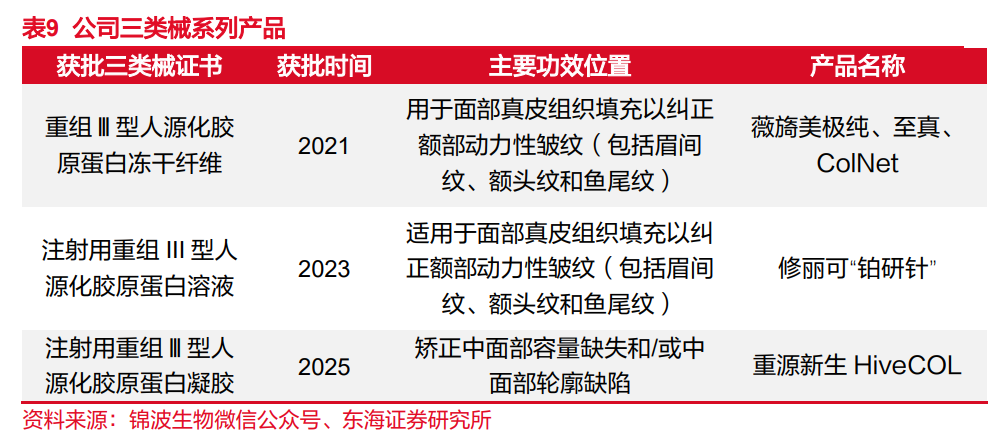 薇旖美为国内首个获批的三类械重组III型人源化胶原蛋白植入剂。公司“重组III型人源化胶原蛋白冻干纤维”于2021年6月获国家药品监督管理局批准上市,是我国首个采用重组人源化胶原蛋白制备的医疗器械,产品在行业内具有领先优势。2023、2025年公司陆续获批注射用重组III型人源化胶原蛋白溶液、注射用重组Ⅲ型人源化胶原蛋白凝胶,目前拥有三款三类械产品。国内医美合规化趋严,三类医疗械的申请流程时间长、要求高,公司产品作为业内仅有的合规产品,具有先发优势。
