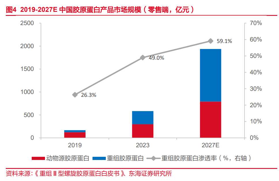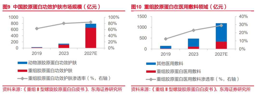目前重组胶原蛋白主要应用于功效性护肤以及医药敷料等领域,其中2023年重组胶原蛋白在功效性护肤以及医药敷料领域的市场规模分别为115.4亿元、110.4亿元,预计2027年两者规模有望达到664.6亿元、346.1亿元,CAGR在2023-2027年达54.9%、25.5%。