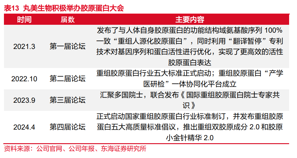 公司积极布局,成为重组胶原蛋白护肤行业的领军企业。公司连续4年举办“重组胶原蛋白科学论坛”,领衔重组胶原蛋白行业标准制定。公司连续4年举办重组胶原蛋白科学论坛,在展示其在重组胶原蛋白技术方面的最新研究成果的同时推动行业技术发展以及探讨未来趋势。2023年11月,受国务院工业和信息化部委托、丸美生物主导制订的行业标准《重组可溶性胶原》通过立项申请,并于2024年4月开展行业标准制定启动会。