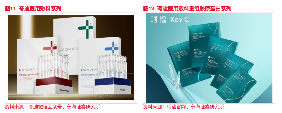 医用敷料:轻医美的流行也推动了术后医用敷料市场不断扩容。医用敷料作为辅助治疗用品,结合了医疗与美容的双重优势,主要针对医疗手术、医美治疗、损伤、过敏等多种皮肤修复场景。敷尔佳、福瑞达、巨子生物、华熙生物、丸美股份等头部美妆企业均推出了医用修复贴或修复液等系列产品。巨子生物于2011年推出可复美品牌,从最初的面向医疗机构客户的皮肤科级别专业皮肤护理品牌逐步扩展至大众消费领域。敷尔佳于2022年7月推出医用重组Ⅲ型人源化胶原蛋白贴;丸美股份于2023年9月推出医用重组胶原蛋白贴敷料和医用重组胶原蛋白液体敷料,华熙生物旗下夸迪针对不同创面护理需求的消费者,推出了包括“绿十字”、“红十字”、“蓝十字”在内的不同系列产品。