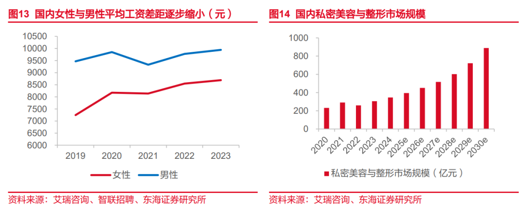 随着女性意识的崛起,私密养护赛道成长空间大。女性消费能力上行,私护观念的提升。一方面,女性受教育程度不断增加,高等教育女性比例逐年上升,文化水平的提升使得女性在消费观念上得到新的突破,也促进了女性经济能力的大幅提升。另一方面,女性经济实力不断上行,根据智联招聘统计,2023年女性职场月平均薪酬达8689元,和男性之间的差距大幅缩小,同时较2019年提高了19.93%。精神和经济的提升共同推动女性消费市场的发展。从市场规模来看,女性私密美容与整形市场有望从2024年的346.1亿元提升至2030年的888.6亿元。