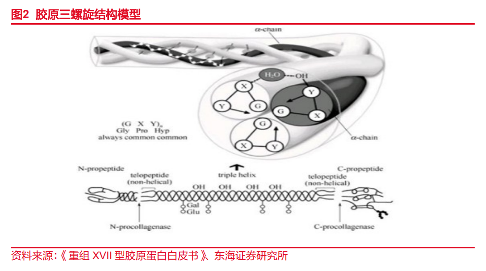 胶原蛋白三螺旋结构使其具备良好的强度和稳定性,推动其应用于多个领域。胶原蛋白的三螺旋结构是指三条左旋ɑ-链相互缠绕构成胶原的右手复合螺旋结构,是其理化特性和生物学活性的基础,使其具备高拉伸强度、生物降解性能、低抗原活性、低刺激性、低细胞毒性,具备止血、促进组织生长、修护损伤、保湿锁水等多种功效。
