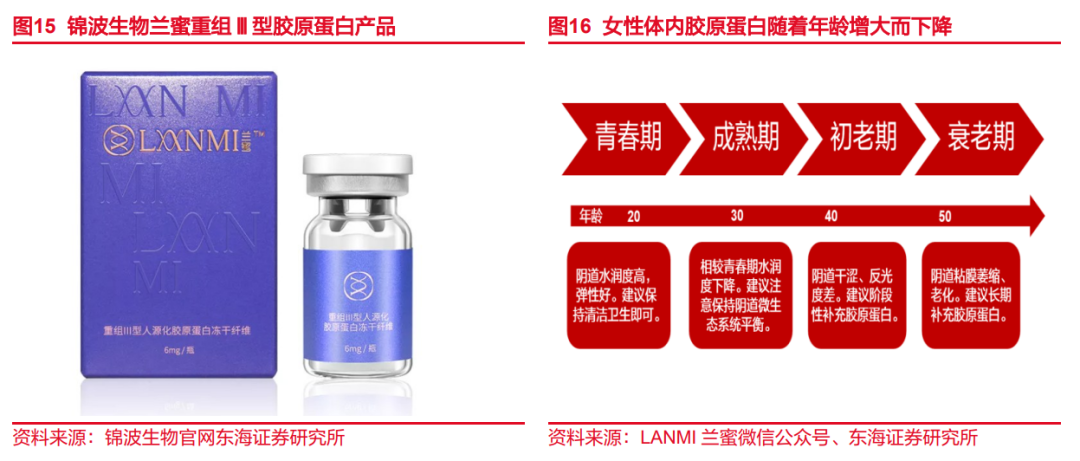 锦波生物推出兰蜜品牌,产品以重组Ⅲ型人源化胶原蛋白为主要成分,该成分与人体胶原蛋白氨基酸序列100%相同,具有高生物活性和水溶性,可有效改善阴道萎缩和干涩症状。