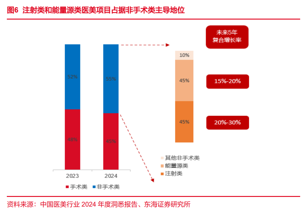 轻医美(非手术类)项目自身创伤小、恢复快、便捷性高,更易获得消费者的认可青睐,非手术类医美市场快速增长。从德勤公布的数据看,2024年非手术类中注射类医美占比达55%,注射类作为轻医美主要项目,未来5年CARG有望保持20%-30%,高速增长。