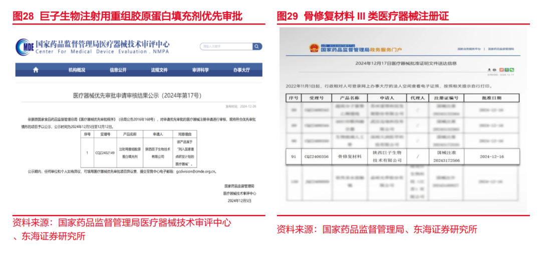 公司三类械产品进入优先审批列表。2024年12月,国家药品监督管理局医疗器械技术审评中心(CMDE)公示了医疗器械优先审核结果,巨子生物旗下产品注射用重组胶原蛋白填充剂因属“列入国家重点研发计划的医疗器械”予以优先审批。2024年12月16日公司获得骨修复材料III类医疗器械注册证。