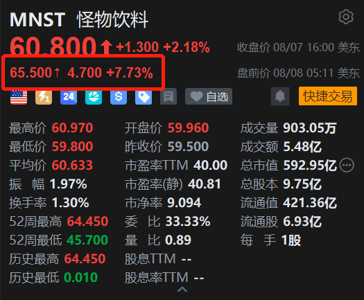 能量饮料制造商怪物饮料(MNST.US)美股盘前涨近8%。消息上,怪物饮料周四公布截至6月30日的季度利润为4.888亿美元,合每股盈利50美分,而去年同期为4.254亿美元,合每股盈利41美分。FactSet的数据显示,扣除某些一次性项目,调整后的每股收益为52美分,高于分析师预期的48美分。收入增长了11%,达到21.1亿美元,分析师预测收入为20.8亿美元。(格隆汇)
