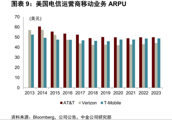 从中国和美国行业内龙头公司的情况看,中美龙头电信运营企业的利润也反映出了用户增长基本持平,导致收入和利润增速持平。