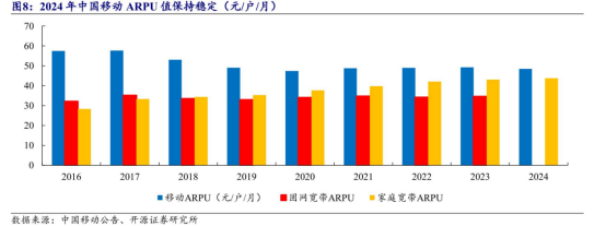 中国移动——2025年上半年数据来看:1)移动ARPU为49.5元,相对稳定;2)家庭综合ARPU达44.4元,同比增长2.3%,主要受益于千兆宽带(客户1.09亿户,+19.4%)和FTTR(光纤到房间)服务(客户1,840万户,+264%)的渗透率提升。3)政企市场企业用户平均贡献约3,393元/半年,同比增长5.6%,主要来自于包括云服务(移动云收入561亿元,+11.3%)、AI应用等。