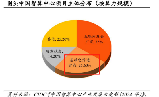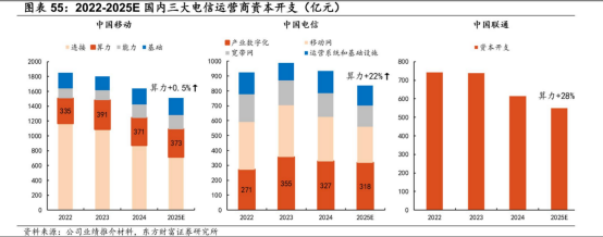 中国移动——2024 年资本开支总额约 1640 亿元人民币,2025 年预算资本开支预计为 1512 亿元人民币。主要投向包括:1)完成240 万个以上 5G 基站建设。2)智算算力规模达到29.2 EFLOPS,新上线多座大型智算中心(呼和浩特、哈尔滨)。