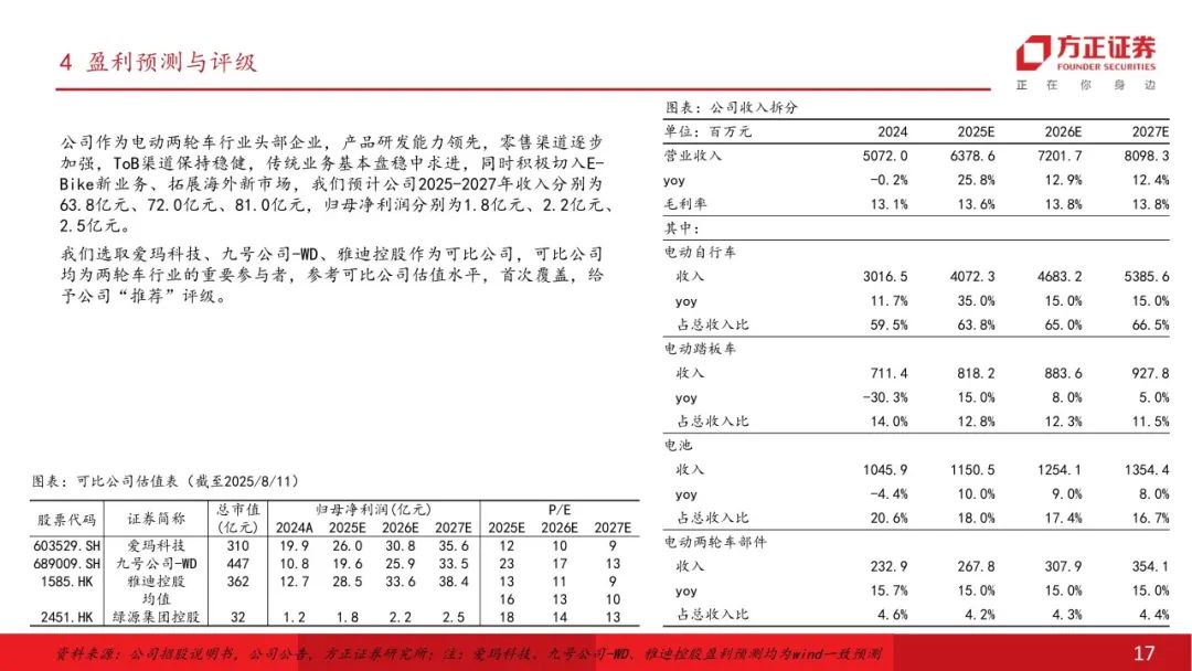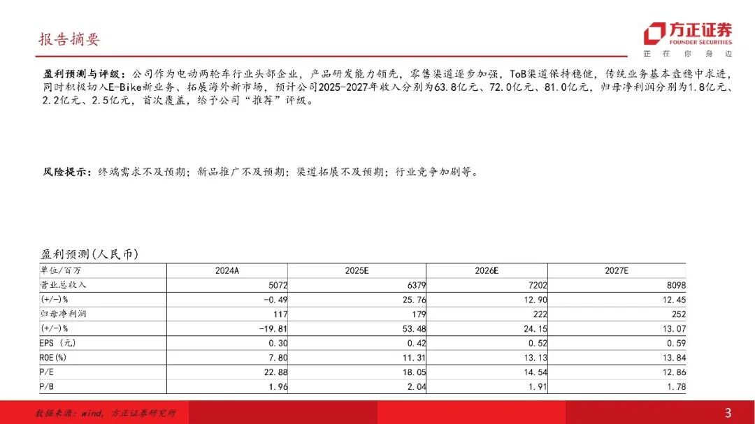 盈利预测与评级:公司作为电动两轮车行业头部企业,产品研发能力领先,零售渠道逐步加强,ToB渠道保持稳健,传统业务基本盘稳中求进,同时积极切入E-Bike新业务、拓展海外新市场,预计公司2025-2027年收入分别为63.8亿元、72.0亿元、81.0亿元,归母净利润分别为1.8亿元、2.2亿元、2.5亿元,首次覆盖,给予公司“推荐”评级。风险提示:终端需求不及预期;新品推广不及预期;渠道拓展不及预期;行业竞争加剧等。