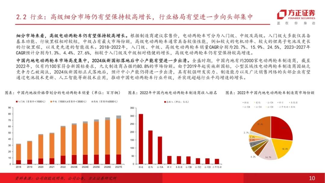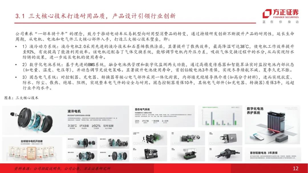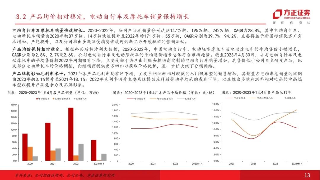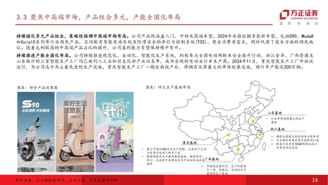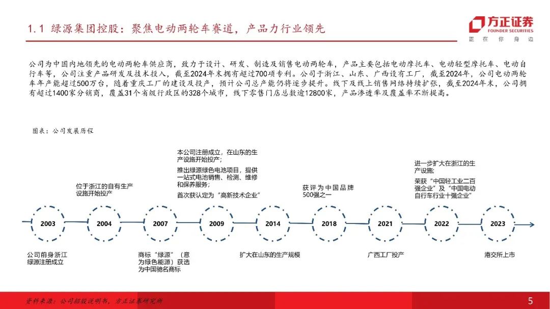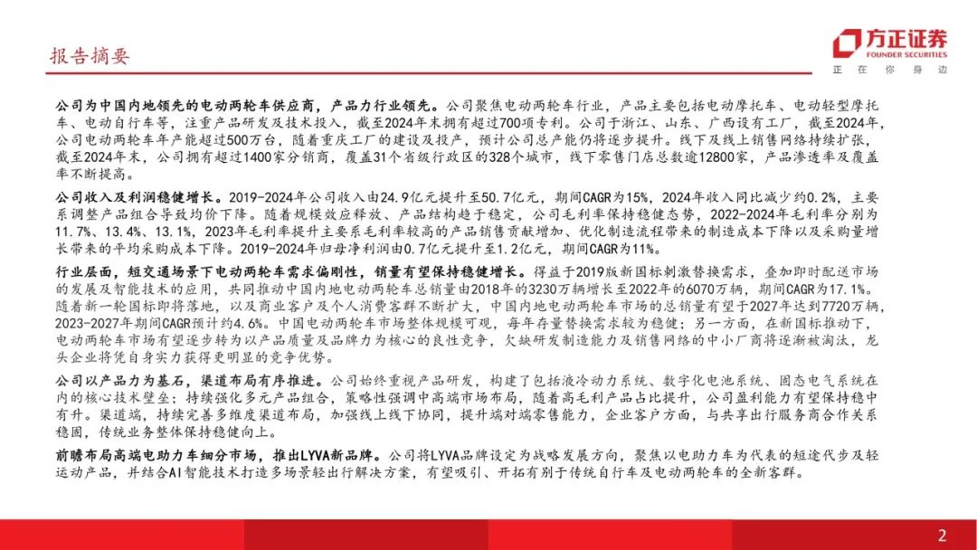 公司为中国内地领先的电动两轮车供应商,产品力行业领先。公司聚焦电动两轮车行业,产品主要包括电动摩托车、电动轻型摩托车、电动自行车等,注重产品研发及技术投入,截至2024年末拥有超过700项专利。公司于浙江、山东、广西设有工厂,截至2024年,公司电动两轮车年产能超过500万台,随着重庆工厂的建设及投产,预计公司总产能仍将逐步提升。线下及线上销售网络持续扩张,截至2024年末,公司拥有超过1400家分销商,覆盖31个省级行政区的328个城市,线下零售门店总数逾12800家,产品渗透率及覆盖率不断提高。