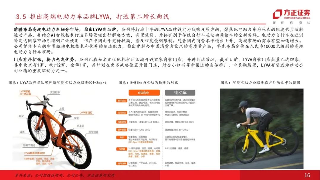 前瞻布局高端电助力车细分市场,推出LYVA新品牌。公司将LYVA品牌设定为战略发展方向,聚焦以电助力车为代表的短途代步及轻运动产品,并结合AI智能技术打造多场景轻出行解决方案,有望吸引、开拓有别于传统自行车及电动两轮车的全新客群。