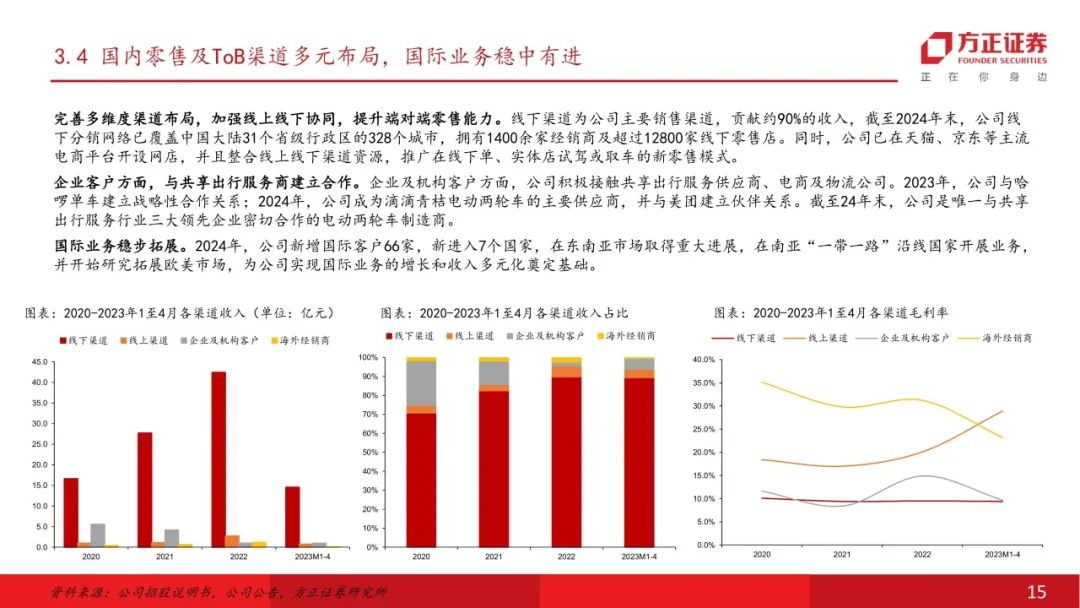 公司以产品力为基石,渠道布局有序推进。公司始终重视产品研发,构建了包括液冷动力系统、数字化电池系统、固态电气系统在内的核心技术壁垒;持续强化多元产品组合,策略性强调中高端市场布局,随着高毛利产品占比提升,公司盈利能力有望保持稳中有升。渠道端,持续完善多维度渠道布局,加强线上线下协同,提升端对端零售能力,企业客户方面,与共享出行服务商合作关系稳固,传统业务整体保持稳健向上。