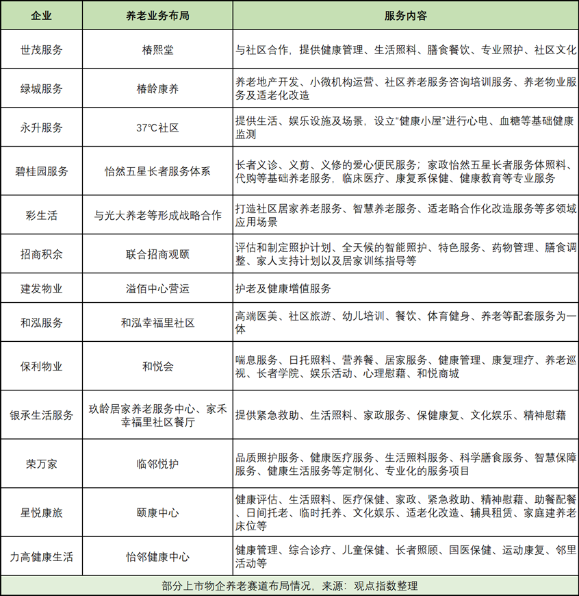 对当下物企而言,康养是少有的、与物业属性相当适配的一个行业。然而,物企们在康养方面仍在起步阶段,尚未形成规模,布局相关业务的上市物企仅有13家左右。