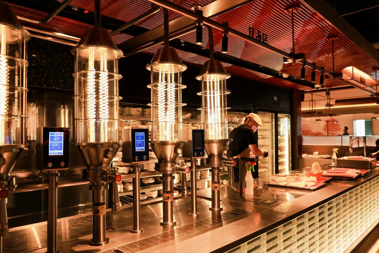 店门口的三台迎宾机器人颇为显眼,服务人员输入桌号后,即可引导顾客至餐位。迎着店门口的则是开放式出菜窗口,后厨采用开放式厨房设计,食材从清洗、加工到摆盘上桌全程透明;门店引入智能打锅机,由系统控制汤料比例,打锅全流程同样可视化。